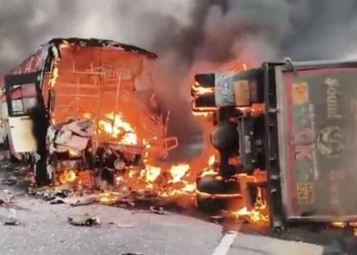In a horrific accident, at least 14 people were burnt alive, and 15 others were injured as a private travel bus caught fire after colliding with a tipper truck in Andhra Pradesh’s Markapuram district on Thursday, police said.