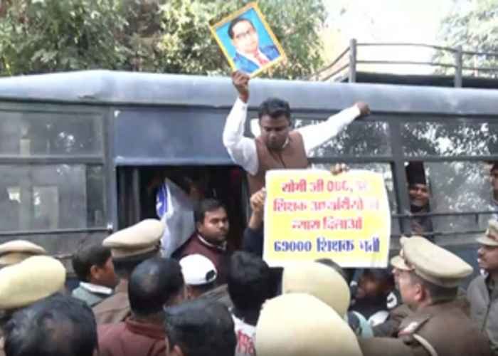 Candidates associated with the 69,000 teacher recruitment case staged a protest in Lucknow on Monday, ahead of the upcoming hearing in the Supreme Court, demanding an early resolution to the long-pending issue.