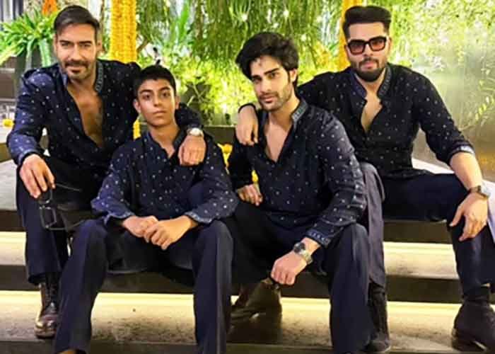 The three Devgan boys – Ajay, Yug, and Aaman were seen twinning in matching Navy blue kurtas with polka dots.