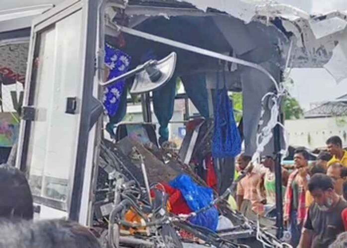 A passenger bus travelling from Indore to Delhi collided with a chemical-laden truck moving ahead of it. The impact was so severe that the front portion of the bus was completely mangled.