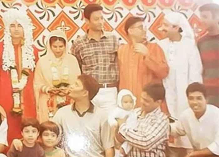 Among the many faces surrounding the bride and groom, a young Irrfan Khan can be spotted.
