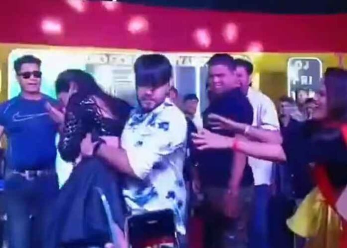 The incident reportedly took place on March 11 during a wedding function in Mauna village. In the viral clip, Bhojpuri singer Dhananjay Sharma is seen lifting a female dancer during a stage performance and pushing her off the stage towards the crowd.