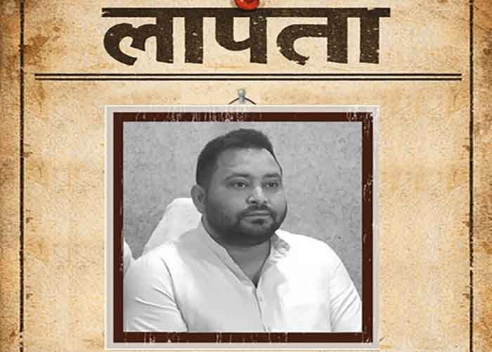 The poster, titled “Search for the Missing Person,” was shared by the BJP on social media and appears to mock Tejashwi Yadav over his prolonged absence from Patna and the Bihar Assembly.