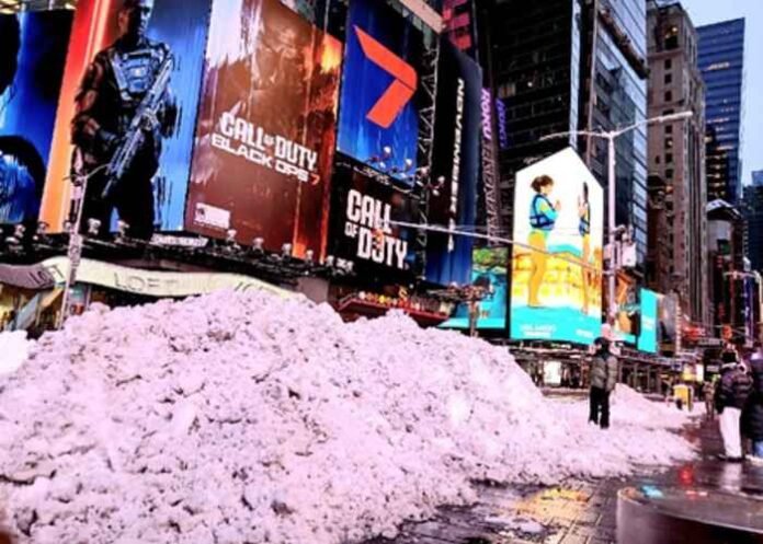 Many tourists flocked to Times Square amid the cleared snow piled into mini-mountains by emergency workers.