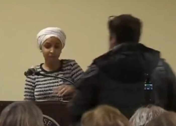 The footage shows a man approaching Omar as she was addressing the gathering from the dais.