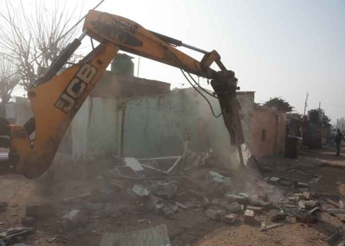 As part of the ongoing state-wide anti-drug campaign ‘Yudh Nasheyan Virudh’, an encroached property belonging to the possession of a drug smuggler was demolished today at Gorakhnath Colony, Barhmajra, under Police Station Balongi, in a coordinated action by the police authorities and Village Panchayat.