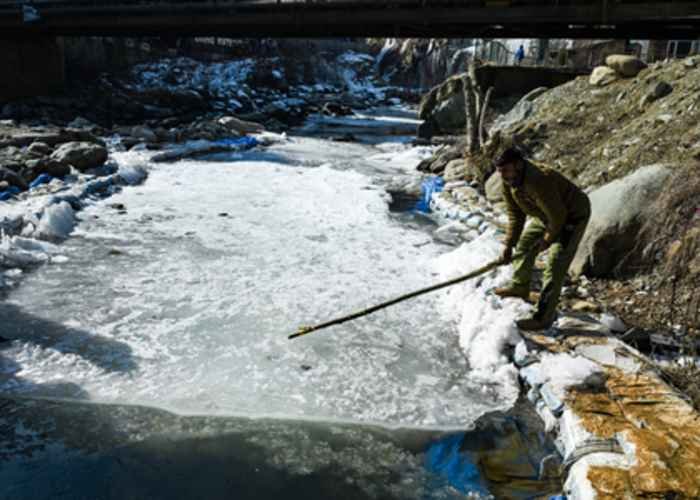All major water bodies, including the Dal Lake in Srinagar city, were partially frozen, making rowing of boats difficult for fishermen and those carrying tourists on a tour of the waterbody.