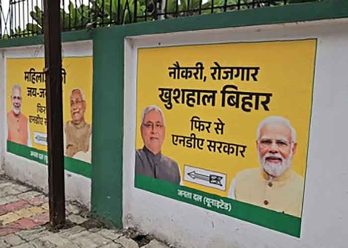 Posters featuring Prime Minister Narendra Modi alongside Bihar Chief Minister Nitish Kumar have been prominently displayed at the Janata Dal (United) headquarters in Patna.