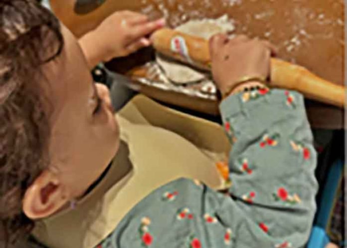 The second photo shows Malti wearing a cute green outfit and making ‘roti’.