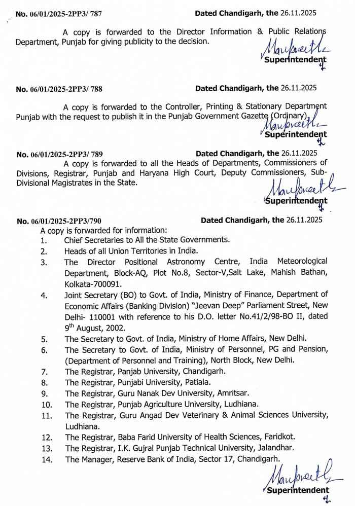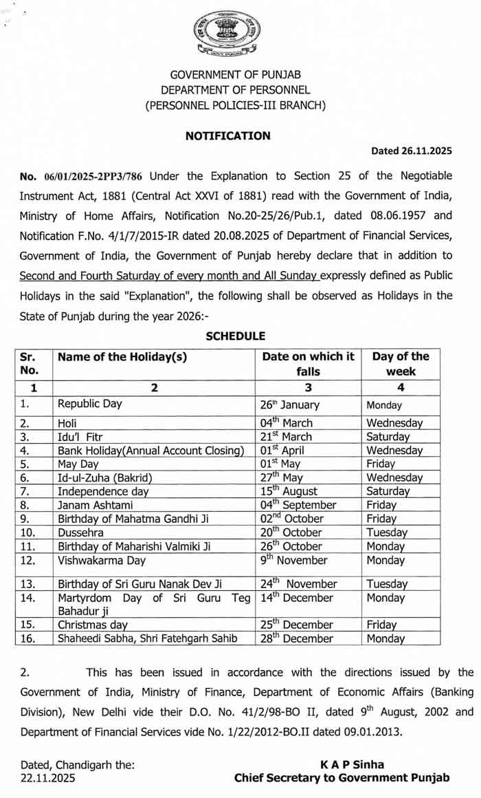 The Punjab Government has released a list of all gazzeted and restricted holidays to be observed in the state during year 2026.