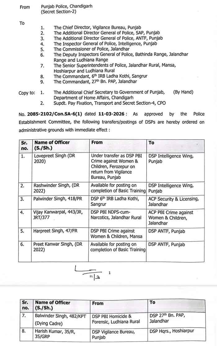 The Punjab Government has Ordered The Transfers and Postings of 8 DSP Level Officers After Approval By The Police Establisment Committee.