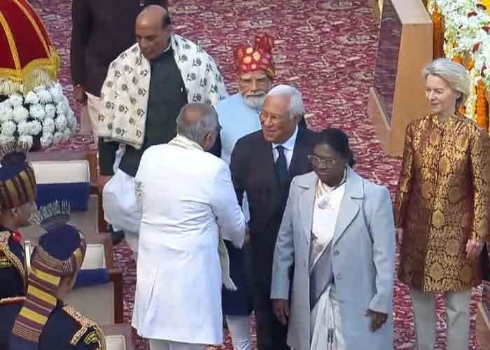President Droupadi Murmu, along with European Council President Antonio Costa and European Commission President Ursula von der Leyen, the Chief Guests for the Republic Day celebrations, were welcomed by Prime Minister Narendra Modi at the saluting base at Kartavya Path.