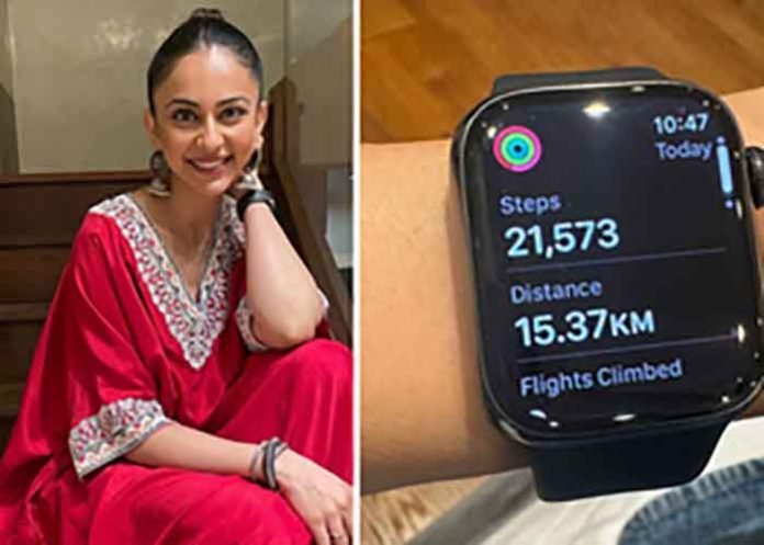 Rakul took to Instagram stories, where she shared a picture of her smartwatch, which mentioned the actress did 21,573 steps and covered a distance of 15.37 kms.