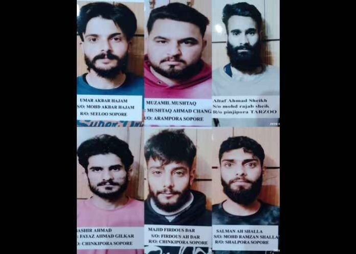 The individuals have been identified as Umar Akbar Hajam, son of Mohammad Akbar and resident of Seelu village in Baramulla; Salman Ahmed Shala, son of Mohammad Ramzan Shala and resident of Shalpora area in Sopore; Altaf Ahmed Sheikh, son of Mohammad Rajab Sheikh and resident of Panzipora Tarzoo village in Sopore; Mubashir Ahmed Gilkar, son of Fayaz Ahmed Gilkar and resident of Naseerabad area in Sopore; Muzammil Mushtaq Changa, son of Mushtaq Ahmed Changa and resident of Arampora village in Sopore; and Majid Firdous Dar, son of Firdous Ahmed Dar and resident of Chinkipora area in Sopore.