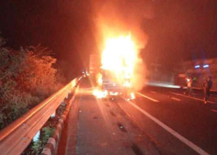 Three people were burned alive when a pickup truck collided with another truck and caught fire on the Delhi-Mumbai Expressway in Rajasthan’s Alwar, police said on Wednesday.